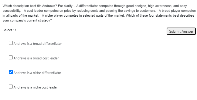 A niche player competes in selected parts of the. Which description best fits Andrews. - A cost leader competes on price by reducing costs and passing the savings to customers.